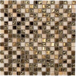 Каменные фрагменты придают мозаике натуральность, а стеклянные - блеск и игру света. Мозайка имеет правильную 15х15 мм форму чипов, позволяющую создавать различные композиции для оформления стен - от простых узоров до сложных мозаичных картин.